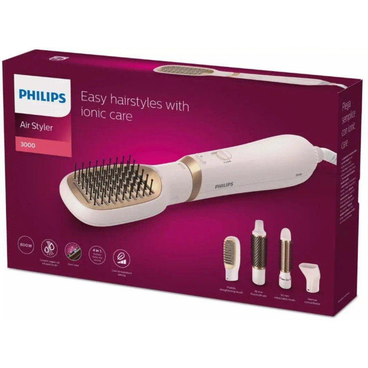 سشوار برس دار تخت برای صافی و خشک کردن با توان مصرفی 800 وات، دارای صفحات سرامیکی با روکش ارگان برای حداقل اسیب به مو، فناوری ایونیک برای فریز کردن و ضد وزی، قابلیت تنظیم حرارت در 3 دما، برس گرد سیمی 38 میل، برس گرد 30 میل، دارای سیم گردان سازنده چین