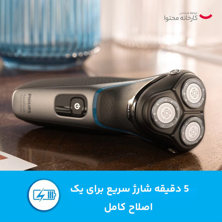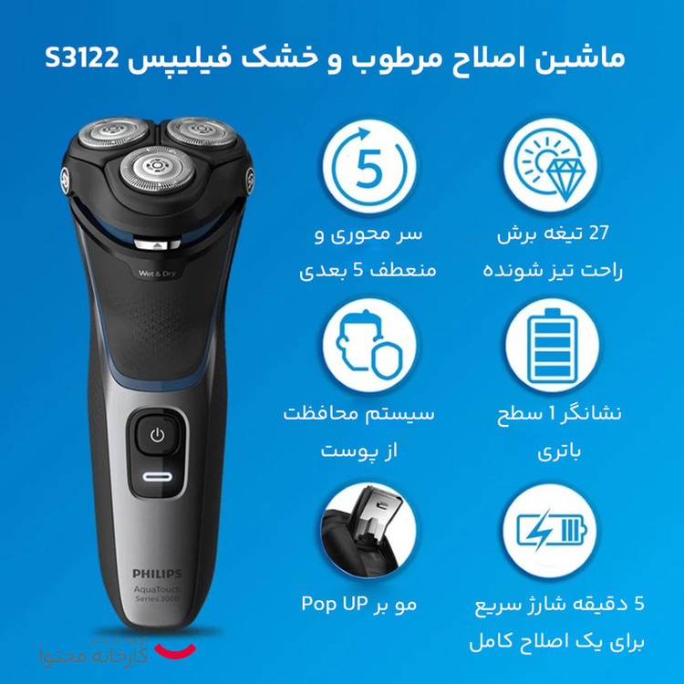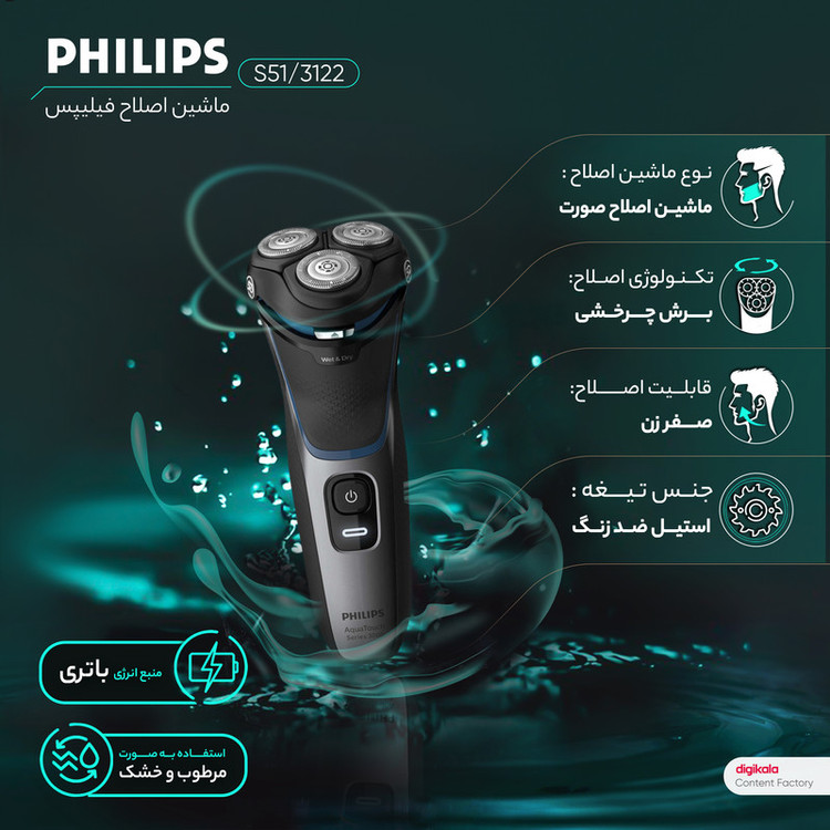 ماشین اصلاح « فیلیپس» (Philips) مدل « S3122/51» از ریشتراشهایی است که از برش چرخشی برای اصلاح دقیق و سریع موی صورت استفاده میکند. علاوه بر سری اصلی، یک خطزن برای اصلاح خط ریش و مرتبکردن ریش و سبیل وجود دارد. این دستگاه به صورت بیسیم کار میکند و از باتری قابل شارژ بهره میبرد. برای شارژ باتری باید آداپتور ارائهشده را مستقیماً به خود دستگاه وصل کرد. تیغههای چرخان ریشتراش شناورند و هنگام اصلاح روی صورت مینشینند و موها را از ته قطع میکنند. قسمت سری ماشین اصلاح صورت S3122/51 را میتوان زیر شیر آب گرفت و خرده موهای روی آن را شست. طراحی بدنهی ماشین اصلاح ارگونومیک است و وزن سبک آن باعث میشود در حین کار با دستگاه خسته نشوید و تجربهی مطلوبی از اصلاح داشته باشید. شما با یکبار شارژ میتوانید از این مدل تا 60 دقیقه استفاده کنید. این ماشین اصلاح به تیغه های خود تیز شونده مجهز شده است.