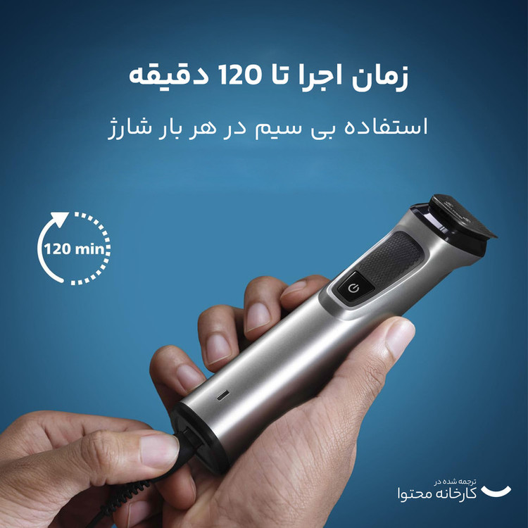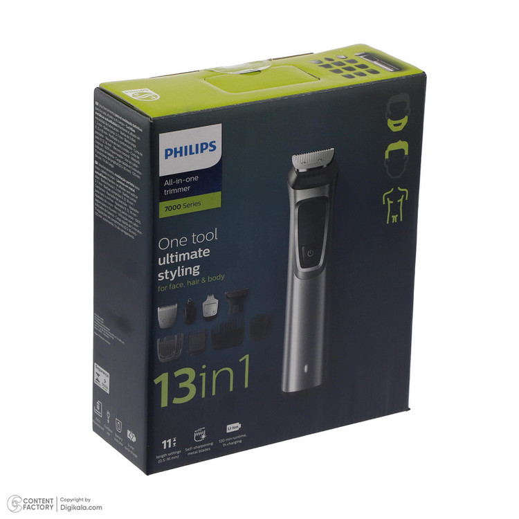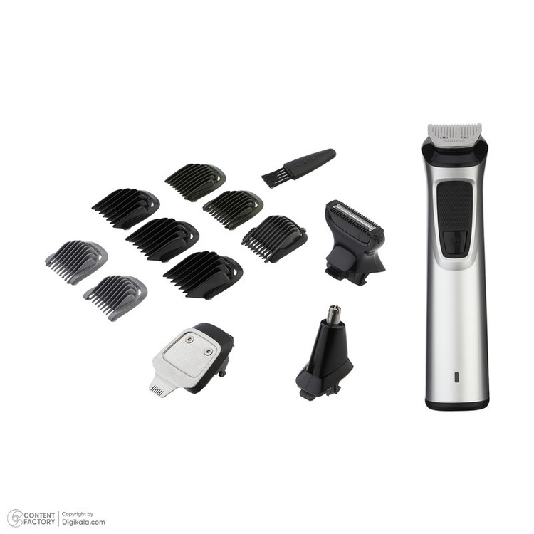 ماشین اصلاح «فیلیپس» (Philips) مدل «MG7715» یک مجموعهی کامل برای اصلاح سر و صورت و بدن است که در مجموع از هشت سری مختلف برخوردار است. میتوانید بسته به نوع موضع اصلاح، از سریهای مختلف دستگاه استفاده کنید. اصلیترین سری ماشین اصلاح یک تریمر عریض است که برای اصلاح سر و صورت کاربرد دارد. پس از استفاده از این سری میتوان به کمک تریمر باریکتر، ریش و سبیل را مرتب کرد. بهعلاوه سری بزرگتری برای اصلاح موهای بدن در نظر گرفته شده است. موزن بینی و گوش هم این مجموعه را تکمیل کرده تا دیگر نیازی به تهیهی یک دستگاه مجزا نداشته باشید. این موزن با برش چرخشی امکان اصلاح سریع و بیخطر موهای زائد را فراهم کرده است. از هشت شانهای که به همراه این ست اصلاح ارائه شده، دو شانهی تهریش (2،1 میلیمتر)، یک شانهی قابل تنظیم ریش (7،3 میلیمتر)، سه شانهی مو (9،12،16 میلیمتر) و دو شانه برای بدن (3،5 میلیمتر) هستند. فیلیپس قابلیت شارژ سریع را برای این ماشین اصلاح در نظر گرفته و در مواقع عجله میتوانید با پنج دقیقه شارژ، دستگاه را دوباره راهاندازی کنید. شارژ کامل یک ساعت طول میکشد و در حالت فولشارژ، دستگاه میتواند تا 120 دقیقه کار کند.