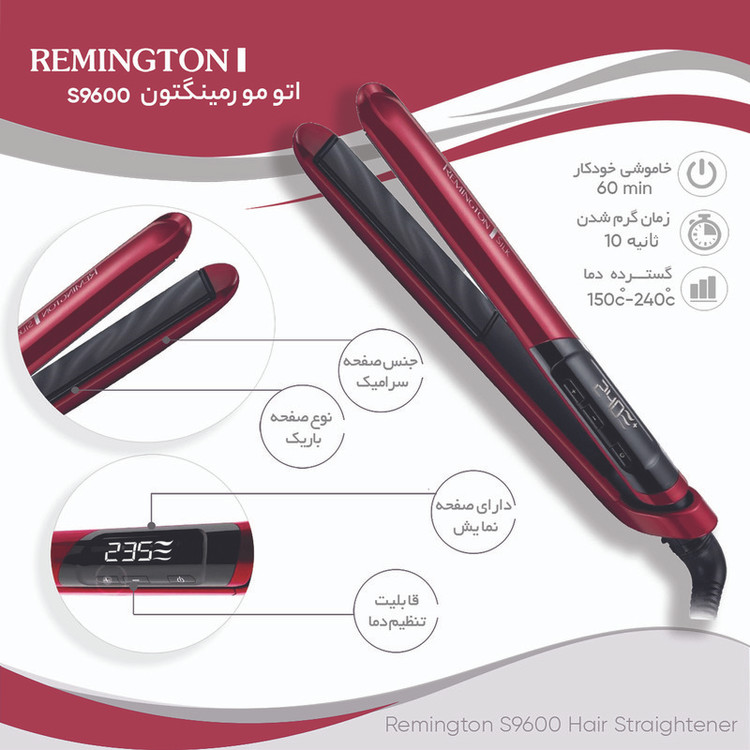 اتو مو «رمینگتون» (Remington) مدل «S9600» متعلق به سری «ابریشم» (Silk) این شرکت است. روی صفحات این اتو مو توسط نوعی سرامیک پیشرفته پوشش داده شده است تا بعد از اتو کشیدن، ظاهر موها نرم و ابریشمی به نظر برسد. طبق گفتهی شرکت سازنده، این پوشش نسبت به پوششهای معمولی سرامیک، تا دو برابر موها را نرمتر میکند. این پوشش کمک میکند که اتو راحتتر حرکت کند و به ساقهی موها آسیبی نرسد و بعد از صاف کردن موها هم حالت وزشدگی کمتر شود. طول صفحات این اتو مو 110 میلیمتر است و سریعتر میتوان موها را صاف کرد. S9600 دارای صفحهنمایش دیجیتال است که دمای صفحات را نشان میدهد. این دما را میتوان از 150 تا 235 درجهی سانتیگراد تنظیم کرد. دمایی که برای اتو کشیدن موها استفاده شده روی حافظهی دستگاه میماند و برای دفعهی بعد احتیاجی به تنظیم مجدد دما نیست. سیستم حرارتی اتو مو مجهز به حالت توربو است که با نگهداشتن دکمهی «مثبت» به مدت دو ثانیه فعال میشود. حالت توربو 30 ثانیه دمای صفحات را به 240 درجهی سانتیگراد میرساند و سپس به دمای قبلی برمیگردد. دمای حالت توربو بسیار زیاد است و تنها برای قسمتی از مو که با دمای معمولی صاف نمیشود باید استفاده شود.یکی از مشکلاتی که هنگام استفاده از اتو مو ممکن است پیش بیاید، لمس ناخواستهی دکمهها و تغییر دما است. درصورتیکه فرد متوجه زیادشدن دما نشود، ممکن است براثر حرارت زیاد به موهایش آسیب برسد. اما خوشبختانه S9600 دارای قفل دما است که با نگهداشتن دکمهی «منفی» به مدت دو ثانیه فعال شده و نشانگر قفل روی صفحه ظاهر میشود. در این حالت همهی دکمهها قفل میشوند و تنها با غیرفعال کردن قفل حرارتی میتوان دما را تغییر داد. درصورتیکه اتو مو روشن بماند، پس از یک ساعت به شکل خودکار خاموش میشود. در انتهای دستهی اتو مو دکمهای قرار دارد که صفحات را روی یکدیگر قفل میکند تا هم از پوشش روی صفحات محافظت شود و هم جای کمتری اشغال کند. البته یک کیف پارچهای هم برای نگهداری بهتر از دستگاه ارائه شده است که در برابر حرارت مقاوم است. از ویژگیهای دیگر این اتو مو باید به سیم سه متری با قابلیت چرخش اشاره کرد که این مدل را برای استفاده در سالنهای آرایش هم مناسب کرده است.