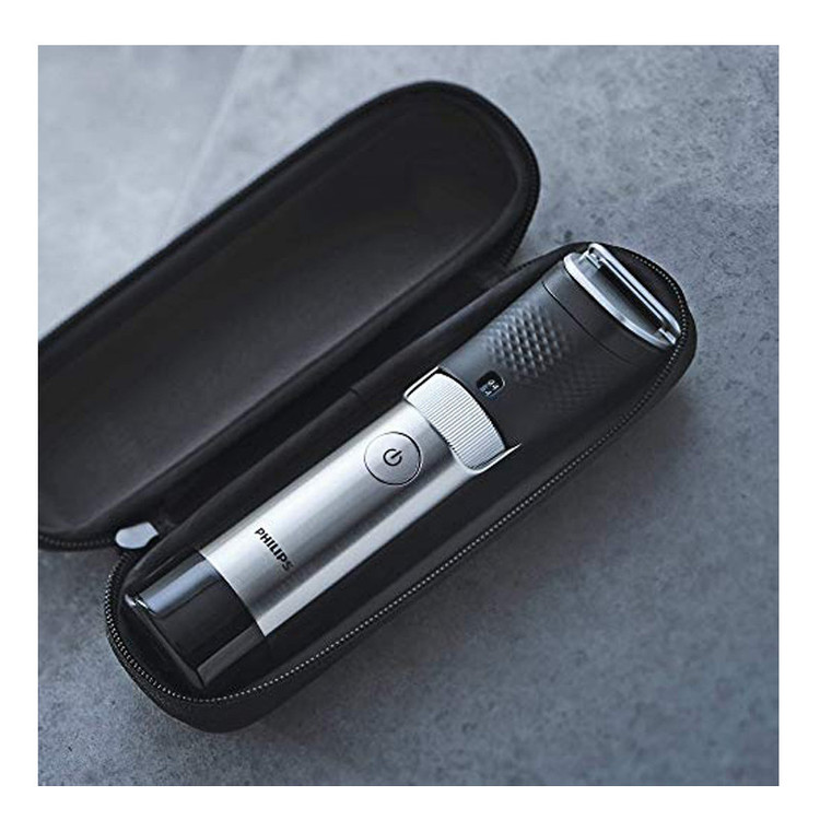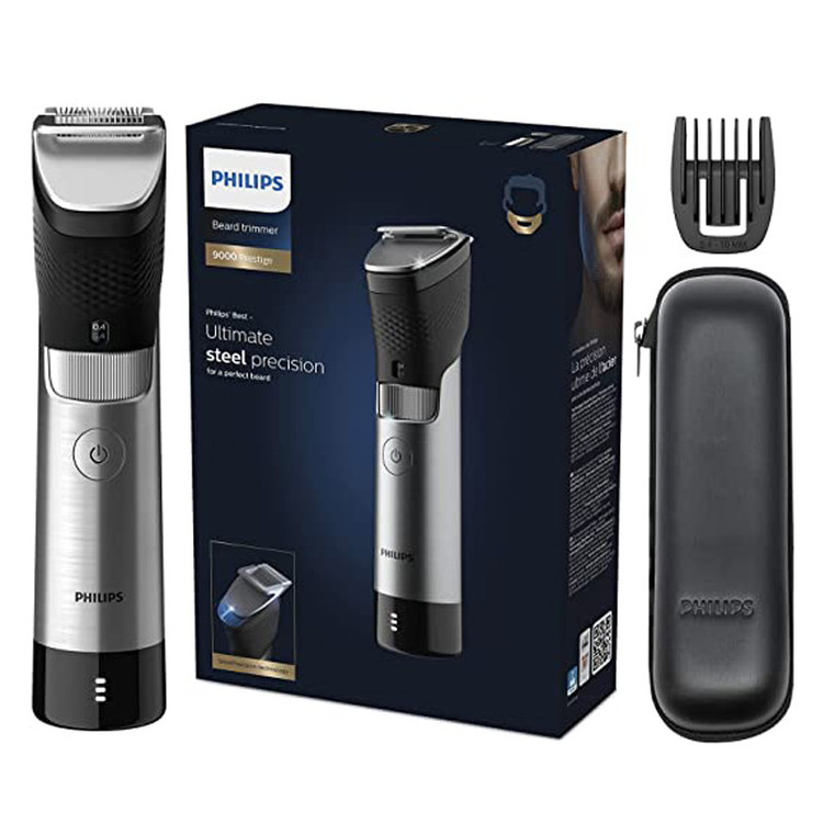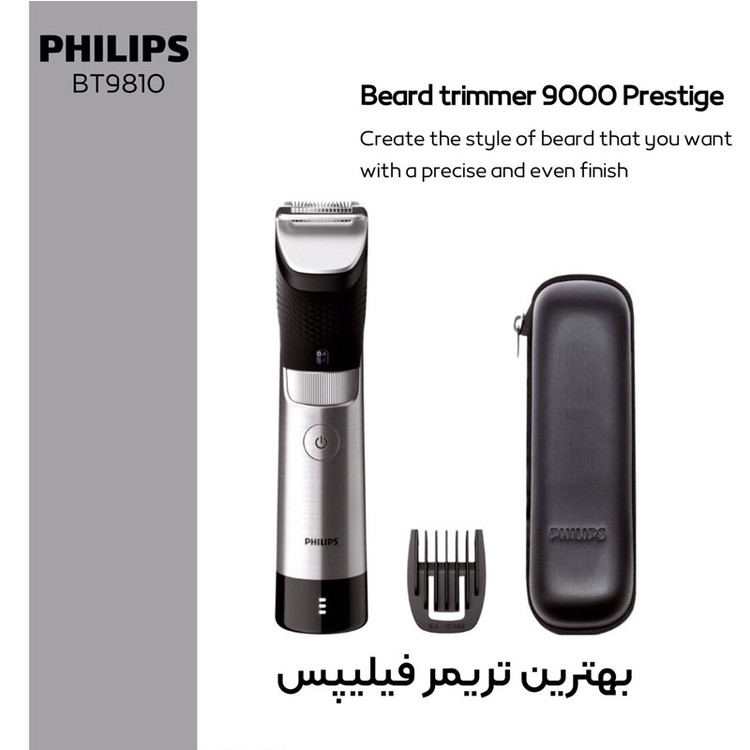 ماشین اصلاح موی صورت فیلیپس مدل BT9810/13 بدون شک بهترین تریمر موی صورت این برند است. این دستگاه به طور خاص برای اصلاح تهریش طراحی شده است و کاملاً ضد آب است. ویژگیهای برجسته این دستگاه شامل تیغههای پیشرفته استیل ضدزنگ و فناوری PowerAdapt Sensor میباشد. این تکنولوژی با سرعت 125 مرتبه در ثانیه ضخامت و بلندی موهای صورت را اندازهگیری کرده و بهترین قدرت موتور را بر اساس آن انتخاب میکند. علاوه بر این، دستگاه دارای شانه فلزی است که از طریق ولوم روی بدنه قابل تنظیم است و قدرت گردش تیغه را از 0.4 میلیمتر تا 5.2 میلیمتر با فواصل دو میلیمتری تنظیم میکند. شانه دیگری نیز در کارتن محصول موجود است که از 5.4 میلیمتر تا 10 میلیمتر با فواصل 0.2 و 0.5 میلیمتر قابل تنظیم است. یکی از ویژگیهای منحصر به فرد این تریمر، باتری قدرتمند لیتیوم یونی است. با شارژ کامل دستگاه در 1 ساعت، به مدت تا 120 دقیقه (معادل 25 بار اصلاح) میتوان از آن استفاده کرد. نشانگر باتری با 3 سطح مختلف روی بدنه دستگاه، میزان شارژ دستگاه را نشان میدهد. همچنین تریمر BT9810 فیلیپس دارای قابلیت استفاده با برق مستقیم نیز است. این دستگاه تحت لیسانس هلند طراحی شده و در کشور چین تولید میشود.