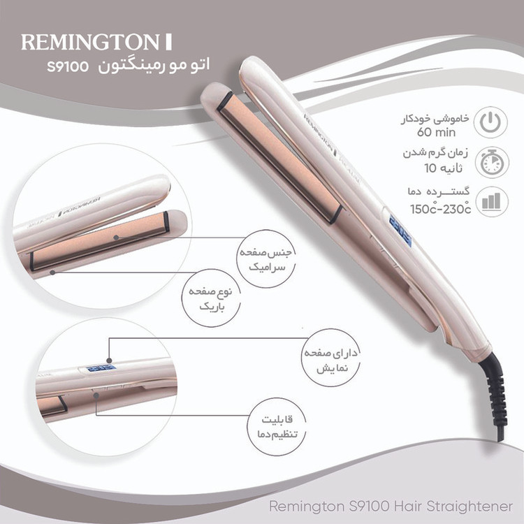 اتو مو حرفهای پرو لوکس رمینگتون مدل S9100 یک محصول پیشرفته مجهز به تکنولوژی گرمادهی هدفمند برای صاف کردن موها است. این صاف کننده قدرتمند، با صفحات سرامیکی کاملا سُر خود، موها را به خوبی صاف کرده و نتایجی ماندگارتر نسبت به اتو موهای دیگر را ایجاد میکند. اتو مو حرفهای پرو لوکس رمینگتون مدل S9100 با طراحی خاص خود کمک میکند تا موها به نرمی بر روی صفحات سرامیکی دستگاه سر بخورند. محصول در دمای مورد نظر بین 180 تا 230 درجه سانتیگراد قابل تنظیم است و با کمترین دما هم میتواند با حداقل آسیب، موها را نرم و ابریشمی کند. این دستگاه یکی از محبوبترین اتوموهای برند امریکایی رمینگتون است که به واسطه زیبایی و کارایی بالای آن مورد توجه خانمها و سالنهای زیبایی زیادی قرار گرفته است. بنابراین برای خرید اتو مو اورجینال و باکیفیت، همیشه یکی از اولویتهای مصرف کنندگان سرتاسر جهان است. این اتو موی (Remington) با رنگ لوکس و شیک صورتی صدفی و رویههای رزگلد طراحی شده و کارکرد آن هم مانند ظاهرش، حرفهای است. بهطوری که میتواند موها را به خوبی و با ملایمت حتی در دماهای پایینتر صاف کرده و تا 5 برابر نسبت به اتو موهای سرامیکی معمولی، موها را نرمتر کند.این دستگاه به تکنولوژی گرمادهی هوشمند OPT مجهز است و گرما را به صورت هدفمندی به قسمتهایی که بیشترین نیاز را دارند، میرساند. عملکرد پیشرفتهی این اتو موی رمینگتون باعث میشود موی مصرف کننده، به حداکثر صافی ممکن برسد و به مراتب ماندگاری بیشتری (تا 24 ساعت) داشته باشد. همچنین با فعال کردن تنظیمات PRO+، به دستگاه اجازه میدهید دما را به 185 درجه سانتیگراد برساند تا بر اثر دماهای بیش از حد، سلامت تارهای مو آسیب نبیند. البته میتوان از تنظیمات دستی دما هم استفاده کرد.اتو مو حرفهای پرو لوکس رمینگتون مدل S9100 دارای صفحات سرامیکی بسیار لیز است که موها به راحتی بین آنها سر میخورند و اصطکاک و آسیب فیزیکی را به حداقل میرسانند. این محصول در 9 درجهی دمایی بین 150 تا 230 درجه سانتیگراد قابل تنظیم است. این اتو مو بسیار خوش ساخت و لوکس بوده و سریعا بدون اینکه بیش از اندازه گرم شود، موها را حالت میدهد. همچنین با صفحات بسیار لیز خود بدون مانع و کندی، روی موها حرکت کرده و تعداد دفعات استفاده را کاهش میدهد.