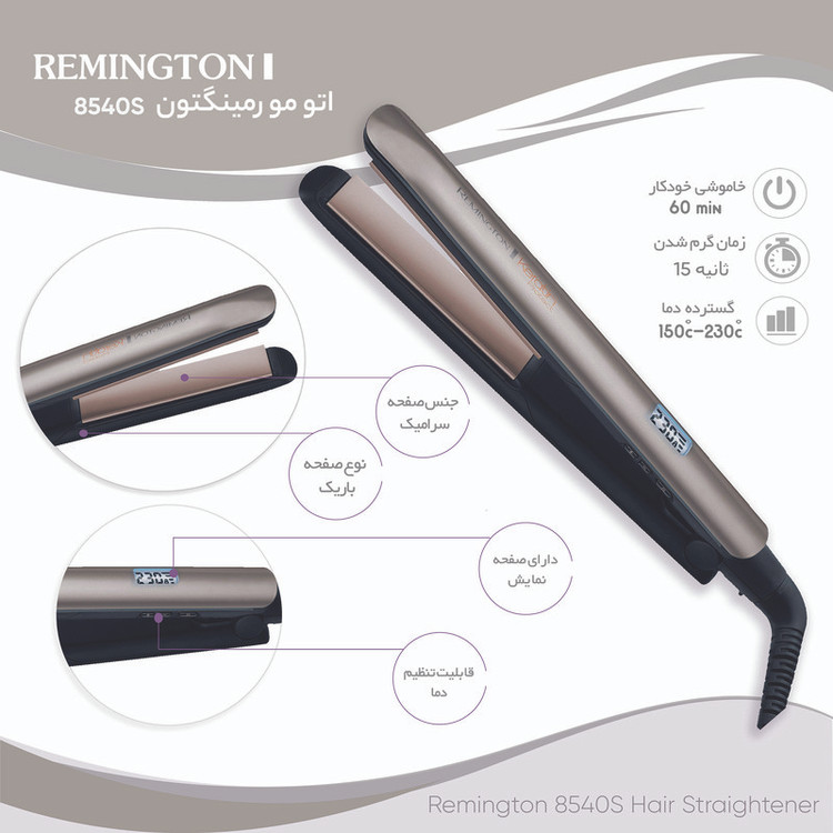 تنها اتو مو مخصوص کار کراتین از شرکت «رمینگتون» مدل «S8540» است. تفاوت این اتو با سایر اتوها این است که برای این اتو مو، صفحاتی از جنس سرامیک با روکش کراتین پلاس و روغن بادام در نظر گرفته شده است که صافی بهتر و بادوام تر با آسیب کمتر را به ارمغان می آورد. همچنین این اتو بهترین گزینه برای کار با مواد کراتین در مصارف حرفه ای است. صفحههای سرامیک کراتین برای سلامتی مو مناسبتر هستند؛ چون سرامیک عایق الکتریسیته و مقاوم دربرابر گرماست؛ بنابراین میزان انتقال الکتریسیته به مو و ایجاد خطر به هنگام استفاده از اتو مو کاهش مییابد. کفههای سرامیکی به دلیل مقاومت دربرابر حرارت، دیرتر فرسوده میشوند و بر همین اساس، عمر بالاتری دارند. همچنین حرارتی که زیر کفههای سرامیکی ایجاد میشود، بهخوبی در سطح سرامیک پخش شده و آن را داغ میکند. همین عامل باعث میشود حرارت به طور یکسان در حین اتوکشیدن به تمام موها منتقل شود. سیستم خاموشی خودکار موجب خاموششدن اتو مو پس از 60 دقیقه میشود که همین عامل، مصرف انرژی را کاهش داده و به ایمنی دستگاه میافزاید. از دیگر ویژگیهای S8540 میتوان به قابلیت تنظیم دما با نمایشگر دیجیتال اشاره کرد. با استفاده از این سیستم میتوان دماهای مختلفی را برای صافکردن موهای خشک، مرطوب، حالتدار و فر همچنین کار با مواد کراتین در نظر گرفت. سیم گردان نیز استفاده از آن را آسان میکند. S8540 اتو مویی مناسب برای استفادهکنندگان حرفهای از جمله آرایشگران است.