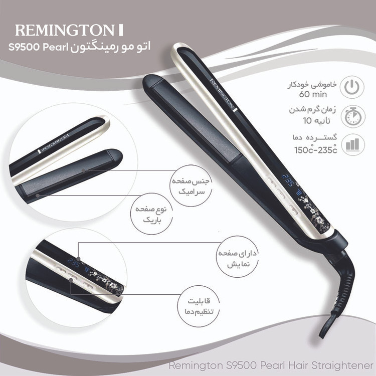 این اتو مو دارای صفحاتی باریک از جنس سرامیک با روکش مروارید است به همین دلیل گرمای فوقالعادهای را تولید میکند. جنس صفحات اتو مو معمولا از استیل یا سرامیک است. اما باید گفت صفحههای سرامیکی برای سلامتی مو مناسبتر هستند. سرامیک عایق الکتریسیته و مقاوم در برابر گرما است. بنابراین میزان انتقال الکتریسیته به مو و ایجاد خطر به هنگام استفاده از اتو مو کاهش مییابد. کفههای سرامیکی به دلیل مقاومت در برابر حرارات، دیرتر فرسوده میشوند و بر همین اساس، عمر بالاتری دارند. همچنین حرارتی که در زیر کفههای سرامیکی ایجاد میشود، به خوبی در سطح سرامیک پخش شده و آن را داغ میکند، همین عامل باعث میشود تا حرارت به طور یکسان در حین اتو کشیدن به تمام موها منتقل شود. S9500 PRO Pearl دارای سیستم خاموشی خودکار نیز هست که باعث صرفه جویی در مصرف انرژی و افزایش ایمنی میشود. بیشینه دمای بالای 235 درجهی سانتیگراد موجب صافشدن سریعتر موها شده است. با استفاده از قابلیت تنظیم دما میتوان موهای خشک، مرطوب، فر و حالتدار را به آسانی صاف کرد. همچنین طول 3 متری سیم و سیم گردان استفاده از آن را آسان مینمایند. بیشینه دمای قابل توجه و امکانات پیشرفته، S9500 PRO Pearl را برای افراد حرفهای از جمله آرایشگران مناسب ساخته است.