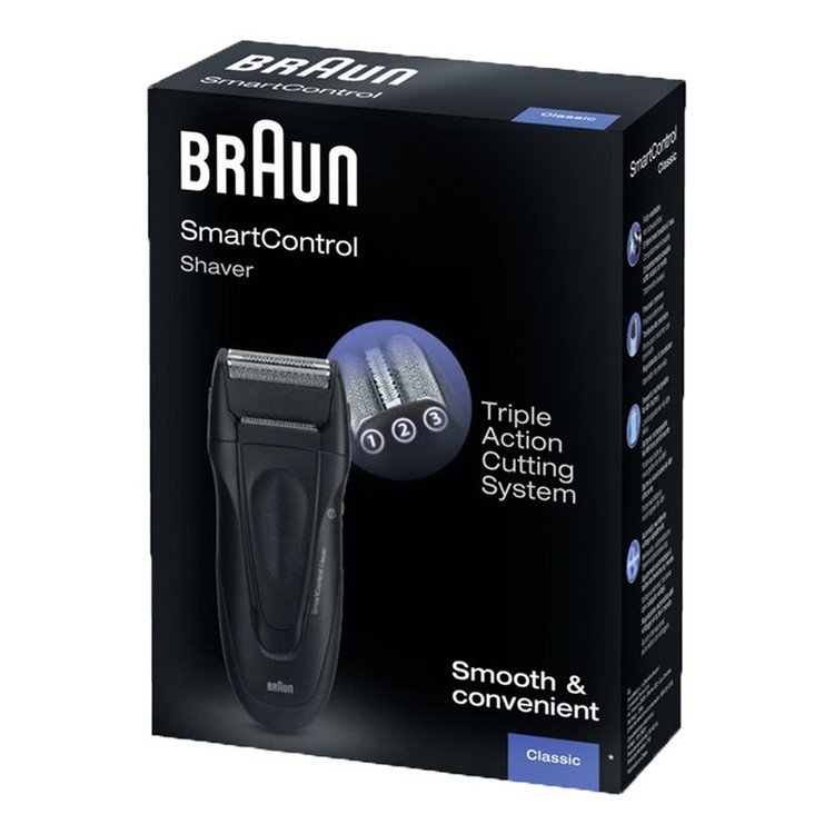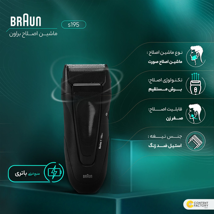 ماشینهای اصلاح فویلی، با داشتن سر سوراخدار به اصلاح موهای صورت از ته کمک میکنند. طراحی سری فویلی این دستگاهها از اهمیت زیادی برخوردار است. ماشین اصلاح s195 ساخت شرکت براون (Braun) با داشتن سری فویلی طراحیشده با تکنولوژی پیشرفته با هر بار حرکت روی صورت، موهای بیشتری را قطع میکند و به این ترتیب سرعت اصلاح بیشتر شده و نتیجهی اصلاح هم رضایتبخشتر میشود. سری ماشین اصلاح دو بخش فویلی و یک تریمر در میان آنها دارد که هر سه در جای خود قابلیت حرکت عمودی دارند و این انعطافپذیری در تماس با پوست، مخصوصاً برای اصلاح نقاط انحنادار صورت مثل چانه و زیر گردن، موجب اصلاح راحتتر میشود. سریهای فویلی دارای طراحی خاص لانه زنبوری موسوم به «SensoFoil» هستند که باعث میشوند تیغهها با قطع موهای هرچند کوتاه موجب اصلاحی از ته شوند. تریمر میانی با تکنولوژی انحصاری براون، حتی موهای خوابیدهی زیر گردن را نیز بلند و قطع میکند. هنگام اصلاح صورت، نقاطی مانند خط ریش وجود دارد که باید توسط خط زن آنها را مرتب کرد. خوشبختانه برای این کار خط زنی متصل به دستگاه در پشت ماشین اصلاح قرار داده شده است که با فشار از پایین به بالا، بیرون میآید و آمادهی استفاده میشود. ماشین اصلاح s195 دارای باتری قابل شارژ است که استفاده از آن را راحتتر میکند. روی بدنه ماشین اصلاح دو نشانگر LED نشاندهندهی حالت شارژ شدن و باتری رو به اتمام وجود دارد. برای تمیز کردن تیغههای اصلی هم میتوان بهراحتی سری فویلی را برداشت و توسط برس تیغه تمیز نمود.
