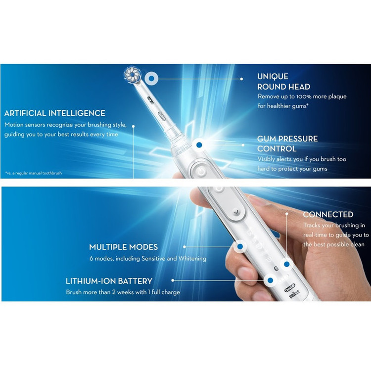 با مسواک برقی Oral-B GENIUS X 20100S از طریق برنامه Oral-B برای اتصال با تلفن هوشمند استفاده کنید تا همانطور که دندانپزشکان توصیه می کنند در مسیر درست مسواک بزنید. Oral-B GENIUS X 20100S دارای فناوری تشخیص موقعیت است که از بلوتوث، تلفن هوشمند و فناوری تشخیص چهره برای ارائه بازخورد تخصصی در مورد عادات مسواک زدن شما استفاده می کند. تشخیص موقعیت به شما کمک می کند بدانید کجا را مسواک زده اید، بنابراین هرگز منطقه ای را از دست نمیدهید. 360 SmartRing با چراغ های LED به شما این امکان را می دهد که تجربه مسواک زدن خود را با انتخاب 12 رنگ شخصی سازی کنید. SmartRing با تایمر و سنسور فشار یکپارچه کار می کند تا بازخورد بصری را در مورد زمان مسواک زدن و فشار مسواک زدن به شما ارائه دهد. این تکنولوژی به شما کمک می کنند تا مطمئن شوید که به مدت 2 دقیقه توصیه شده مسواک بزنید و در عین حال مطمئن شوید که با فشار مناسب مسواک می زنید تا از مسواک زدن بیش از حد از آسیببه لثه ها محافظت کنید.مسواک برقی Oral-B GENIUS X 20100S بسیار پیشرفته دارای سر گردی است که توصیه دندانپزشکان است که هر دندان را با حرکات نوسانی، چرخشی و ضربانی پویا احاطه می کند و تا 500٪ بیشتر از یک مسواک دستی معمولی پلاک را از بین می برد. فناوری سنسور فشار سرعت برس را برای محافظت از لثه کاهش می دهد. سازگار با سرهای برس Oral-B برای رفع هر نوع نیاز مراقبت از دهان و دندان های شما است . سازگار با سری های : Sensetive - Precision Clean - 3D White - Cross Action - Floss Action - TriZone - Pure Clean است . شامل 5 حالت تمیز کردن هر روز لبخند سفیدتر خود را نشان دهید.