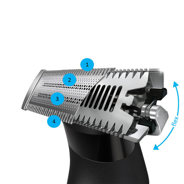 تیغه این دستگاه دارای فناوری 4D-Blade که یک تیغه با 4 عنصر برش، متشکل از 2 دستگاه اصلاح جانبی و 2 منطقه اصلاح مرکزی است و 450 حرکت در ثانیه انجام میدهد. به سبب این فناوری نوین شما میتوانید بالاترین ظرافت اصلاح را تجربه کنید. انعطاف پذیری سری این دستگاه سبب اصلاحی بدون نقص در تمامی زوایای صورت و بدن میشود. این دستگاه دارای 5 عدد شانه به شمارههای 1،2،3،5 میلی متر برای صورت و شماره 0 میلی متر برای بدن است.