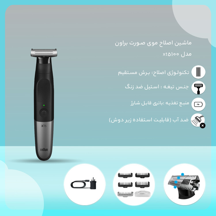 ماشین اصلاح براون مدل XT5100 مناسب برای اصلاح ریش و بدن است. تیغه 4 بعدی آن یک اصلاح آسان ، راحت و ملایم را ارائه میدهد. این ماشین اصلاح و ریش تراش 100% ضد آب بوده و میتوان به صورت مرطوب(زیر دوشی) ، خشک یا به همراه فوم و ژل اصلاح استفاده کرد. شما میتوانید به سبب طراحی باریک ، دستگیره ضد لغزش و تیغه 4 بعدی، اصلاحی دقیق، ظریف و آسان را تجربه کنید.