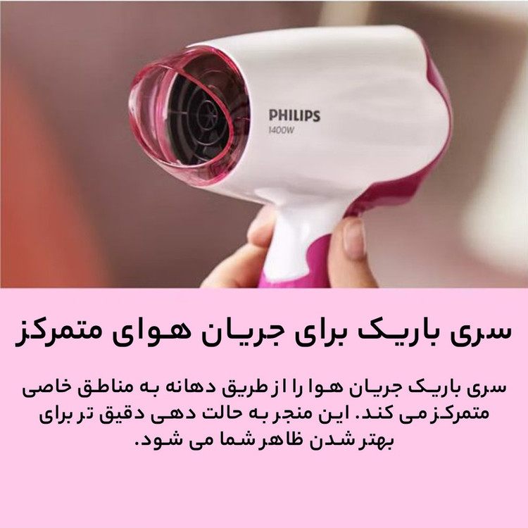 سشوار مسافرتی فیلیپس مدل BHD003 ترکیب پایداری از توانایی خشک کردن و حالت دهی را با هم دارد. این سشوار طراحی جمع و جوری دارد که هم میتوان از آن در خانه استفاده کرد و هم آن را به سفر برد. به این شکل هرجایی که باشید میتوانید حالت دلخواه موهایتان را نیز داشته باشید! این سشوار 1400 واتی دارای 2 تنظیم سرعت/دمای مختلف دارد که بنا به نظر شما قابل انتخاب است. همانطور هم از اسم آن معلوم است قابلیت جمع شدن دارد تا انبارش آسانی داشته باشد و در کنار ویژگی ارگونومیک و سبک بودن، آن را یکی از سشوارهایی میکند که طراحی مدرنی دارد.